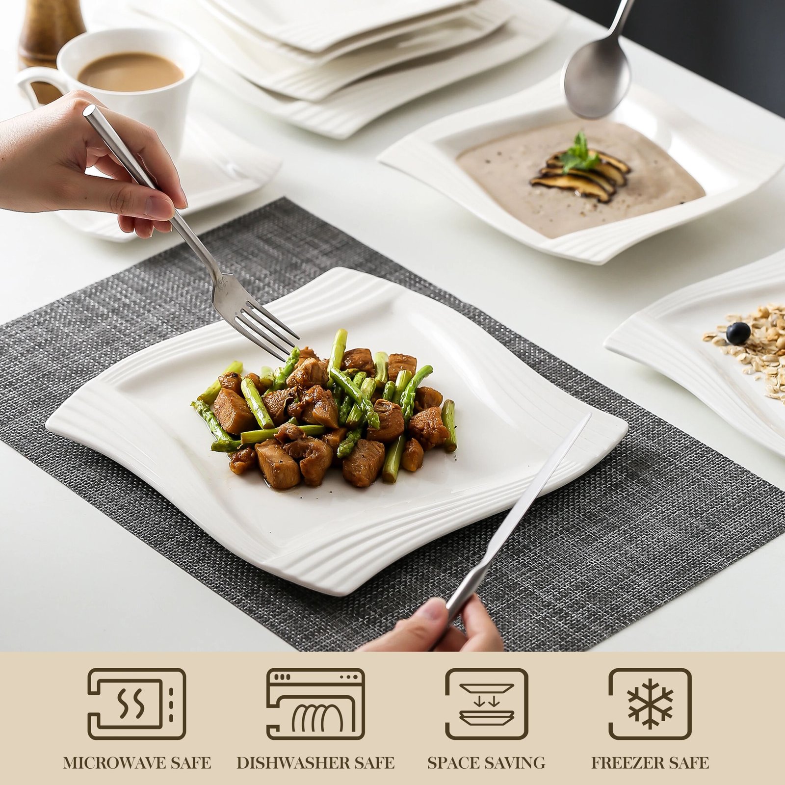 ● Hochwertige Materialien und Sicherheit: MALACASA-Geschirrsets bestehen aus elfenbeinweißem Porzellan, das FDA-zertifiziert, bleifrei und cadmiumfrei ist und sich perfekt für den täglichen Gebrauch eignet. Die klassische quadratische Form verleiht Ihrem Esstisch eine elegante und stilvolle Note.