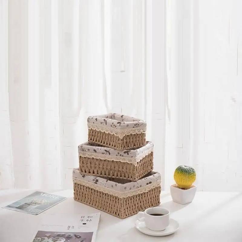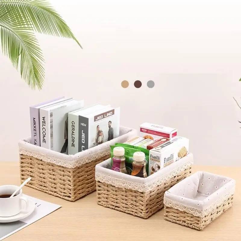 Die Aufbewahrungskörbe sind mit hochwertigem Papierseil gewebt. Das Innere der Körbe wird durch einen Stahlrahmen fixiert, was eine Verformung verhindert. Exquisite Verarbeitung und Haltbarkeit machen sie zu einer idealen Wahl, um kleine Haushaltsgegenstände zu organisieren.